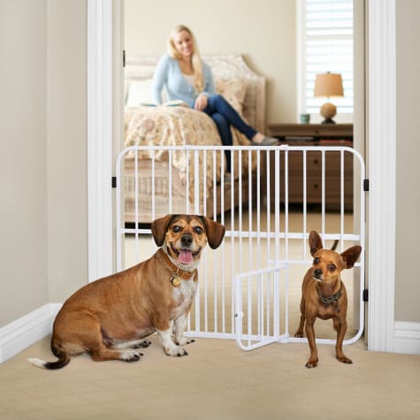Our carlson pet products lil tuffy expandable gate with small pet door is great for wide spaces.